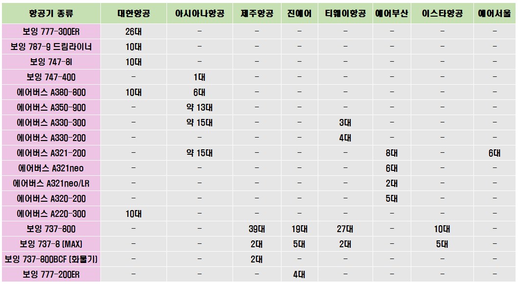 그렇다면, 대형항공사와 저가항공사가 보유 중인 비행기(항공기)의 종류와 보유현황은 어떨까요?