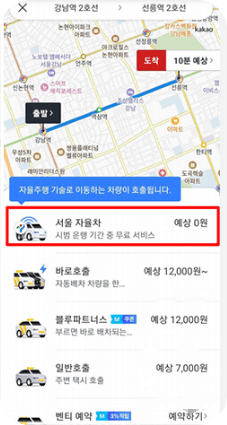 먼저, 이용 방법부터 살펴볼까요? 생각보다 간단합니다. 우리가 늘 사용하는 카카오T 앱을 통해 호출할 수 있어요. 출발지와 목적지가 모두 서비스 지역 내에 있다면, '서울자율차' 아이콘이 활성화됩니다.