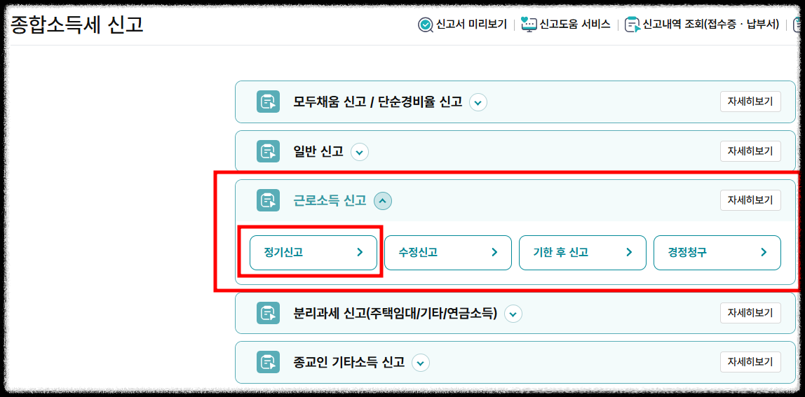 - 홈택스 - 세금신고 - 종합소득세 신고 - 근로소득 신고 - 정기신고