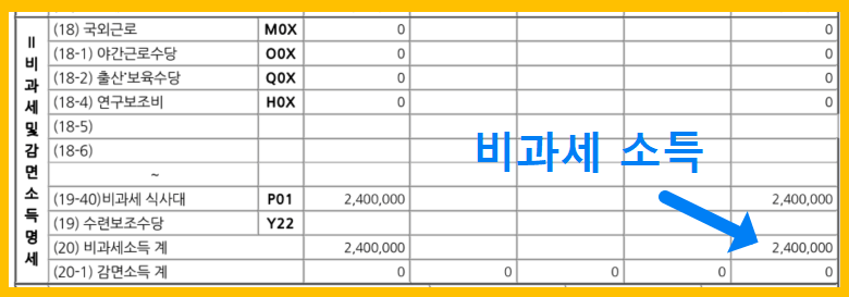그런데, 1년 총소득 중에서 세금을 내지 않는 소득(비과세)이 있습니다. 밥을 먹거나 출장 가서 숙박비 영수증을 회사에 제출해서 현금으로 돌려받는 항목이 비과세입니다. 식비, 출장비 등이 있죠.