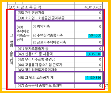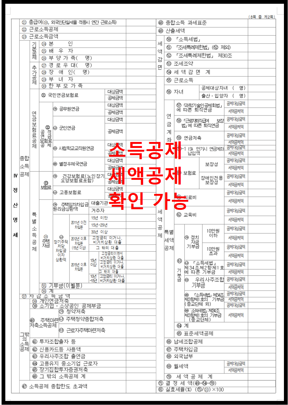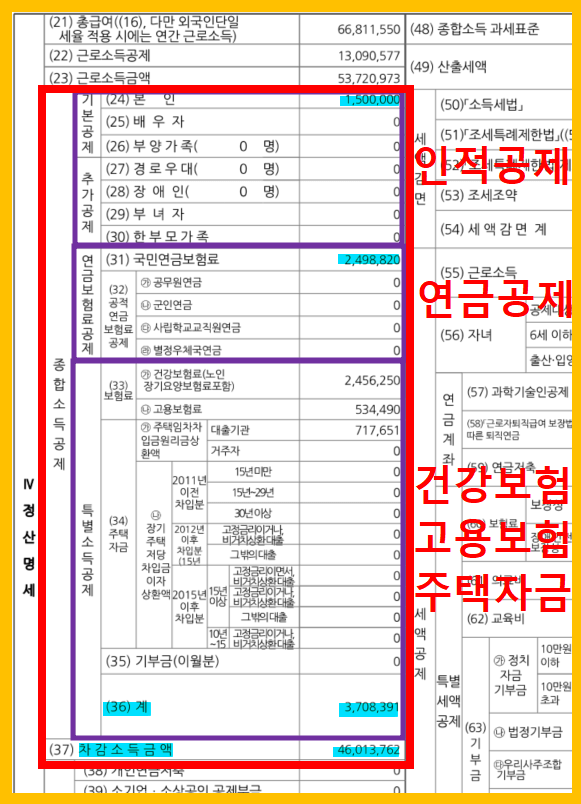 모든 소득공제에 대한 내용을 확인할 수 있는데요, 사진에서 각 항목을 구분해 놨으니 확인하시면 됩니다.