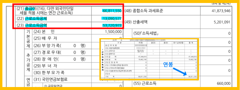 - 근로소득금액: 총급여에서 근로소득공제를 뺀 금액입니다.