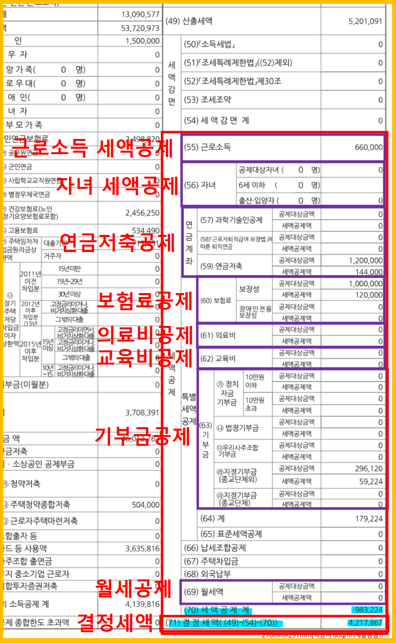 마지막으로 빨간 박스에 본인이 1년 동안 세액공제받은 내용이 전부 표기되어 있으며, 산출세액에서 이들의 총합을 빼면 결정세액이 계산됩니다.