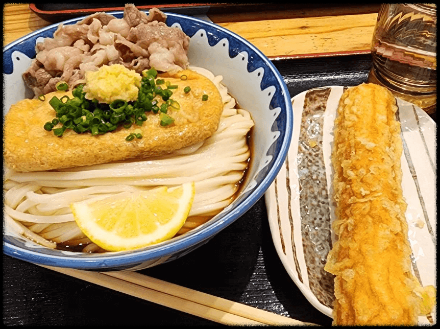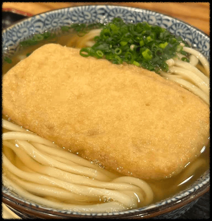 - 점보 유부 우동 (980엔) – 큼지막한 유부가 가득 들어간 인기 메뉴
