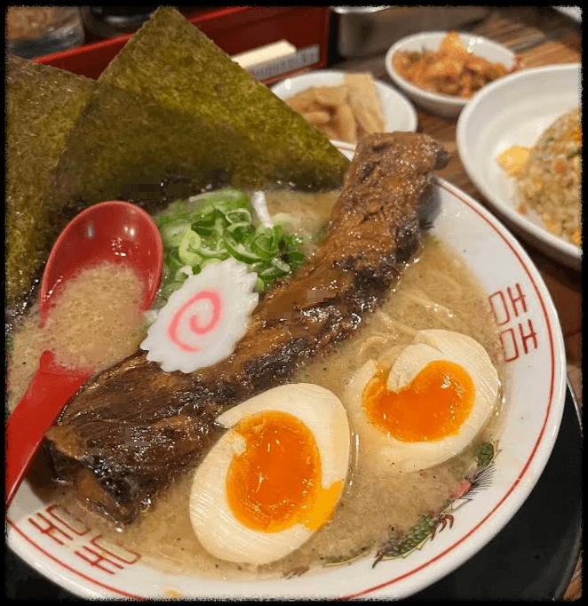 • 행복 라멘 (1,050엔) – 진한 돼지뼈 국물에 부드러운 차슈