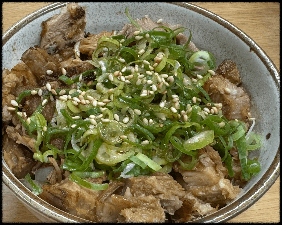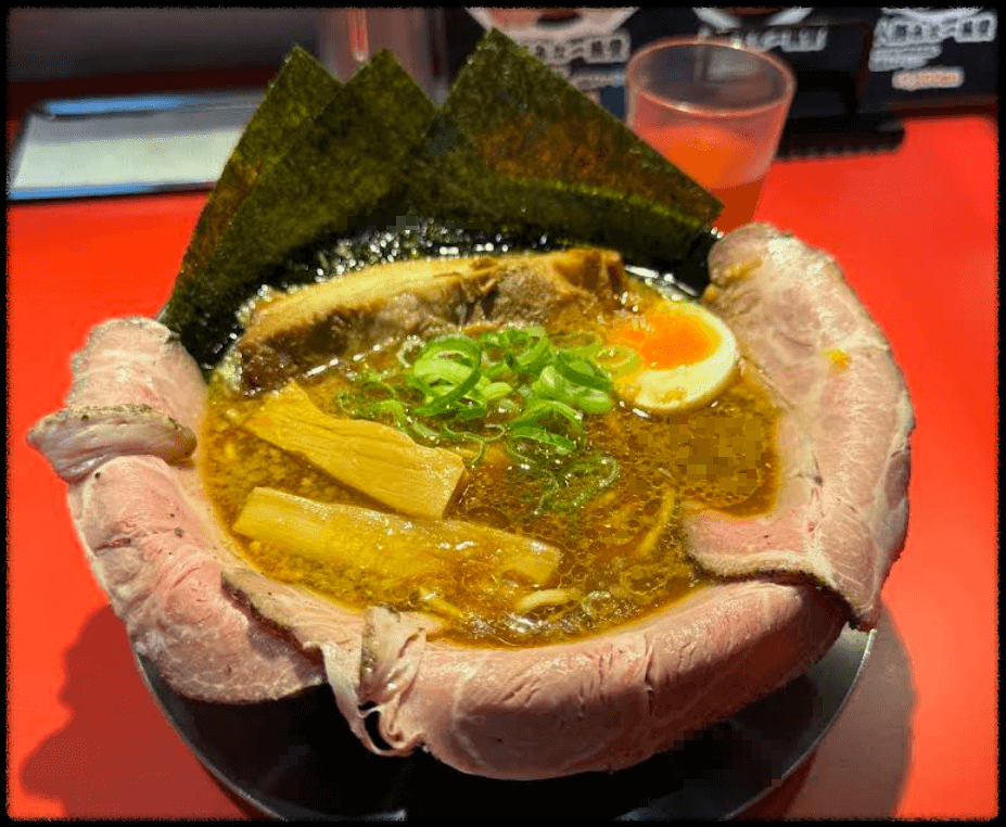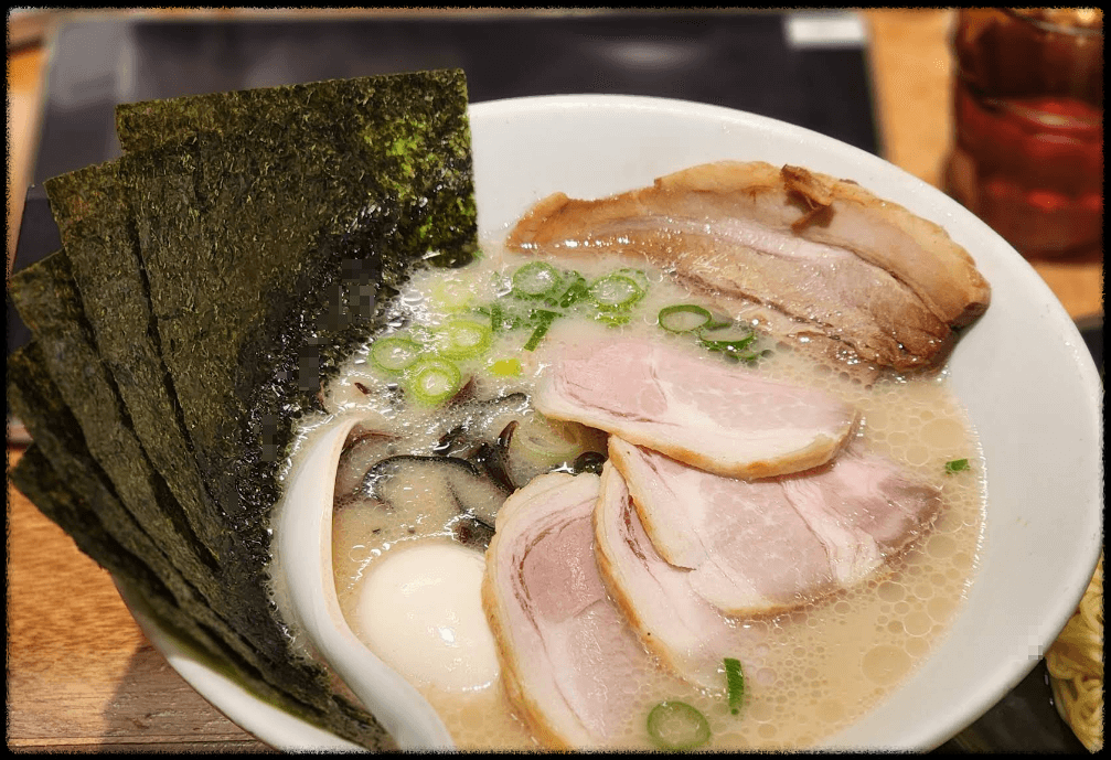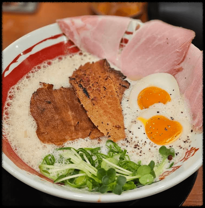 - 행복 라멘 (1,050엔) – 진한 돼지뼈 국물에 부드러운 차슈