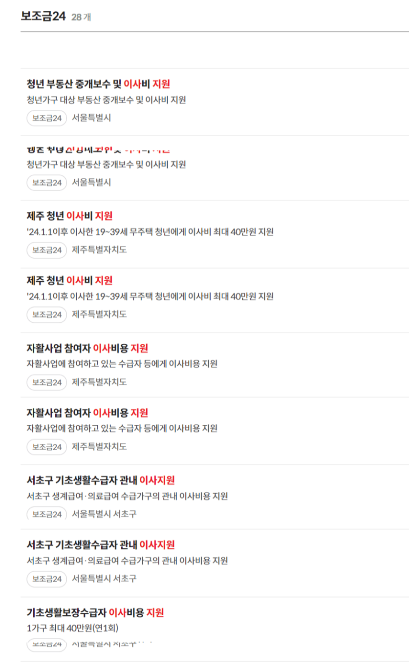 각 지자체에서 운영하는 이사지원 프로그램에 대해서는 정부에서 운영하는 '보조금 24' 사이트를 이용하면 쉽게 찾을 수 있습니다.