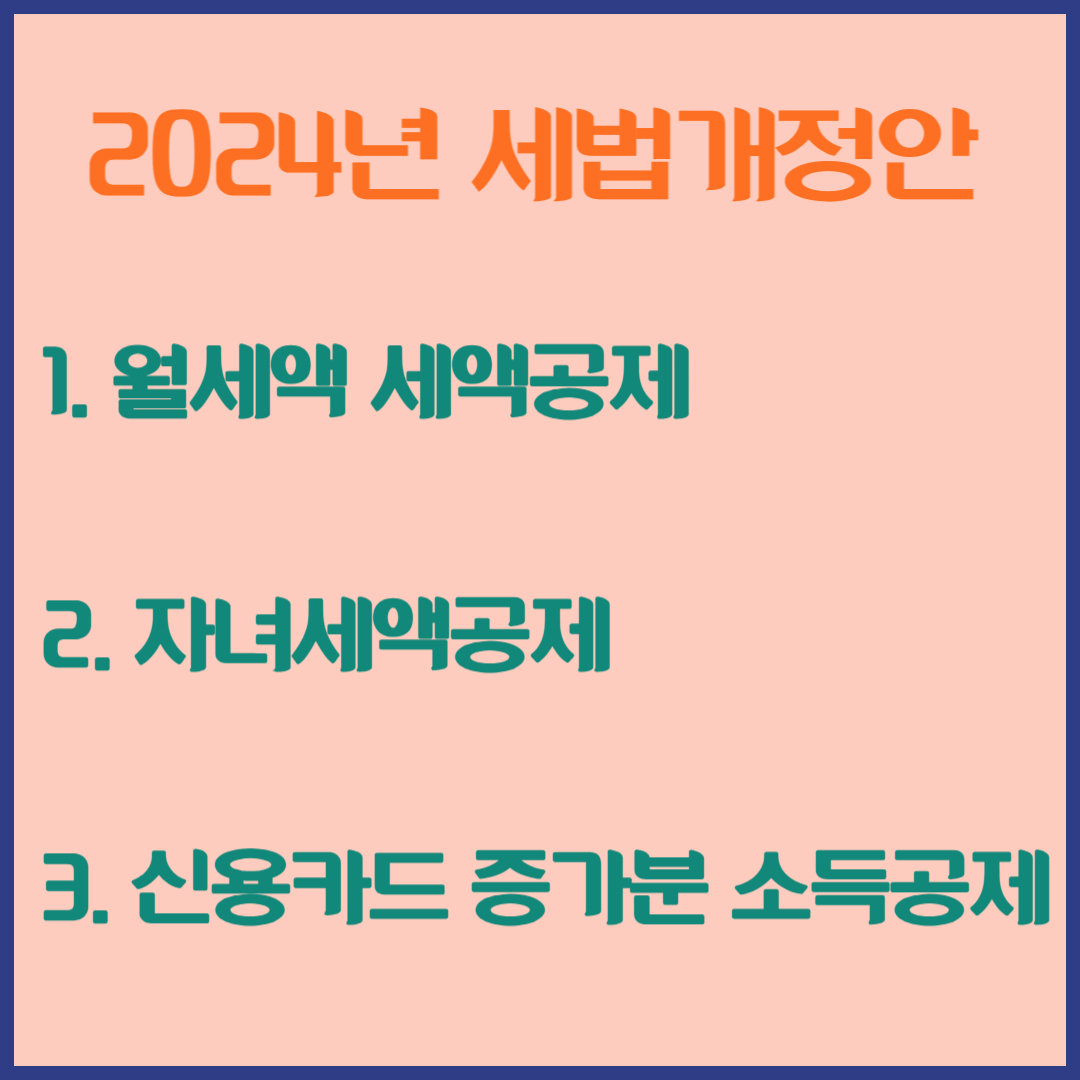 2024년에 바뀌는 세법개정안 중에 대표적으로 직장인들이라면 관심 가질 만한 내용은 조세특례제한법에서 월세액 세액공제 소득기준 및 한도 상향, 신용카드 사용금액 증가분에 대한 소득공제가 있으며, 소득세법에서 자녀세액공제가 확대되는 내용이 있습니다.